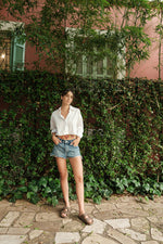 Elevate your look with this crop shirt, adorned with a unique trim of multicolored shells. The subtle yet striking detail adds a beachy, boho flair, perfect for summer days or casual outings.