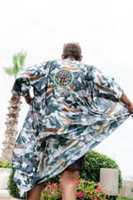 Petroleum and brown brushstroke printed mandela featuring a brown arrows border and a vibrant aqua tree patch on the back for a stylish, standout look.