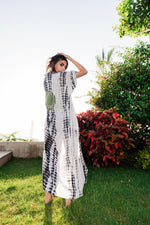 Bold black and white mandela featuring a zebra border and a neon square patch on the back for a unique, eye-catching design.