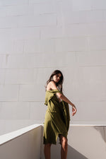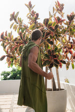 Kaki sleeveless linen hoodie kimono featuring a striking black patch on the back, offering a stylish and comfortable piece for a modern, casual look.