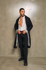 This black reversible coat features sleek stripes on the outside and a chic monochrome pattern on the inside lining. Offering two stylish looks in one, it’s a versatile piece that adds a touch of modern edge to any outfit.