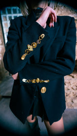Make a bold statement with this Black Oversized Blazer featuring gold buttons, crafted from 100% wool-blend fabric for a stylish, comfortable, and sophisticated look.