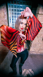 Make a bold statement with the Red Tiger Off-the-Shoulder Top, crafted from 100% silk-touch fabric for a soft, luxurious, and stylish look.