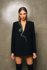 This black blazer makes a bold statement with unique snake detailing running across the front. A sleek and edgy design, it adds an unexpected twist to a classic silhouette, perfect for those who like their style with a bit of bite.